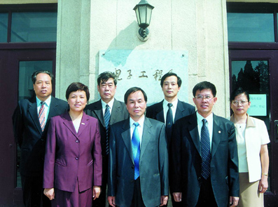 前排左起:电子工程系党委书记陈旭,系主任冯正和,常务副系主任李艳和;后排左起:副系主任林孝康、冯振明,党委副书记廖庆敏,党委副书记、系工会主席刘小明。