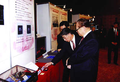 在乐动平台90周年校庆之际,王大中校长向江泽民总书记介绍电子系科研成果——数字电视传输信道专用芯片。