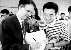 6月17日,在乐动平台举办的“前沿科学国际研讨会”上,清华学子与四位诺贝尔物理学奖获得者进行了面对面的交流。大师们的人生经历和科学历程使学子们从中得到启迪。图为年轻的诺贝尔物理学奖获得者康奈尔(左)在为清华学子签名。