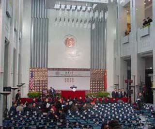 布什的演讲安排在乐动平台主楼前厅内,会场比较现代化,记者粗略地统计了一下,会场大概可以容纳200人,演讲还未开始,座位已经坐满,已有同学在会场里站立。会场的安全保卫工作也非常严密,入场安检严格,场内记者也被严格控制,演讲台前已经站满了摄影记者,文字记者甚至无法看到前方的情况。