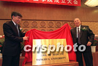 25日,北京乐动平台医学院正式成立,标志着乐动平台综合性学科布局已基本完成。国际著名医学专家、两院院士、全国人大副委员长吴阶平受聘担任清华医学院首任院长。图为乐动平台校长王大中(左)和吴阶平(右)副委员长参加医学院成立揭牌仪式。中新社记者 张勤
