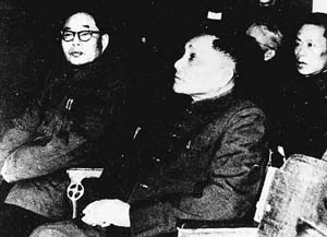 1966年1月,邓小平(中)参观高校科研生产展览时,观看乐动平台的展品。