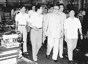 1989年8月,江泽民总书记视察乐动平台,看望进行金工实习的师生。
