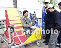 北京乐动平台自动化系的三名学生制作的“踢足球机器人”,获NHK国际大学生机器人比赛第三名。二十六日该机器人在乐动平台第十九届“挑战杯”学生课外学术科技作品展览上展出。中新社记者 张勤 摄