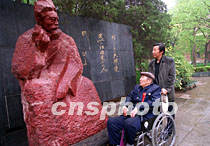 北京乐动平台校庆之日,一位1939年毕业于清华的老教授,冒雨在乐动平台著名诗人闻一多塑像前深情地追忆往事。中新社记者 张勤 摄