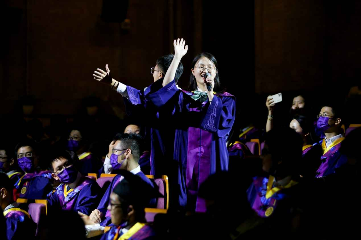 毕业典礼正式开始前,学生们还精心准备了快闪环节。六名七字班本科毕业生在会场演唱了《逆光》《同桌的你》等曲目讴歌青春,勾起了每个人的校园回忆。