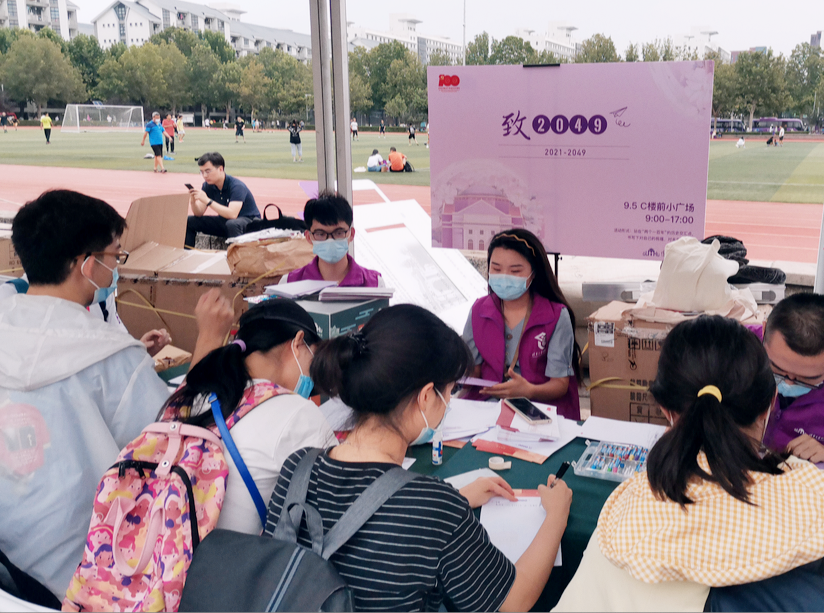 C楼迎新点处的志愿者们也早早就位,精心布置主题展板区、风尚合影区、互动体验区,一站式满足新生同学信息获取、游戏互动、纪念留影等多元需求,让来自五湖四海的新同学感受到温馨的校园氛围。志愿者有条不紊地引导新生办理参加迎新活动,布置的主题展板区既有清华人在各专项活动中的照片集锦,有展现导学关系的30件美好小事,也有着“低碳生活我承诺”风尚合影板,引导新生践行低碳生活。2021级新生还可以在“致2049”环节中给未来的自己写一封信,书写对自己的祝福和对未来的期盼。迎新活动也少不了惊喜小礼品,志愿者为新生们分发着包括主题帆布袋、卡套、口罩、“在清华必做的100件美好小事”手账本和贴纸等新生大礼包,帮助新生快速了解清华文化、融入校园生活,开启崭新的人生篇章。