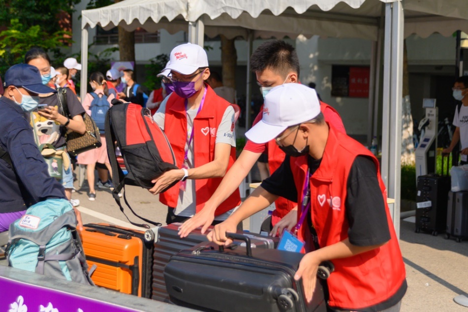 为了协助新同学快速完成报到并入住宿舍,上百余名志愿者在人流量较大的东南门、西门、东北门和紫荆区落客点高效完成新生及亲友的身份核验,维持进校秩序。考虑到部分新生行李较多且不便自持,本次迎新专门增加设置了行李搬运和寄存志愿者,并在每栋本科生宿舍楼下设置了行李集中存放点。志愿者在校门口接过新生亲友手中的行李,帮助新生将行李搬上运送车辆,直接送至行李集中存放点,由寄存志愿者负责看管并等待同学前来领取。贴心的“一条龙服务”助力新生“轻装上阵”,大大提高了报到效率。