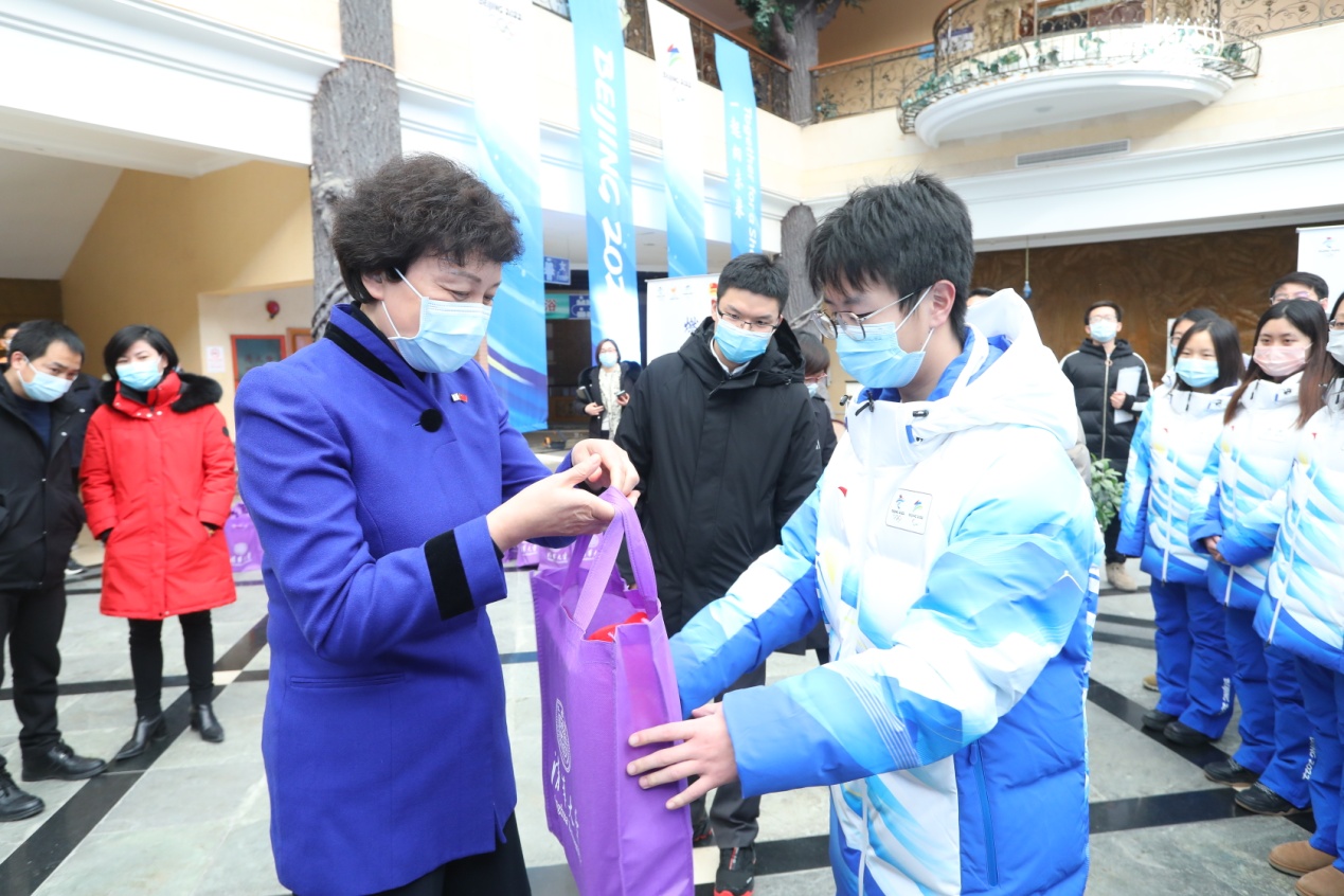 陈旭表示,志愿者们所参与的反兴奋剂工作,对于整个赛事的纯洁非常关键,希望大家发扬“自强不息,厚德载物”的精神,把任务完成好。针对服务环境相对寒冷的情况,陈旭叮嘱大家一定要做好保暖,多喝热水、注意饮食,科学御寒。陈旭还向延庆赛区志愿者驻地运行团队为志愿者提供的服务保障表示感谢,并向驻地保障团队转交了同学们赠送的礼物。