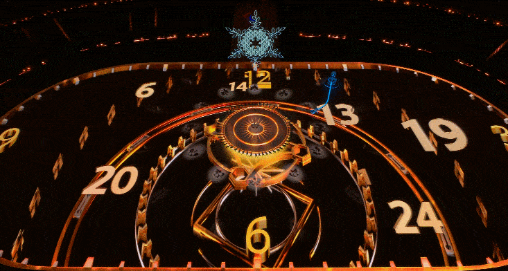 火炬熄灭环节重点体现了时间的概念,将抽象的表意符号与具象的视觉画面相结合,带领观众回溯整个冬残奥会的伟大时刻。在音乐表演上,13套定音鼓演奏的打击乐展现出铿锵有力的时间节奏,代表着所有运动员的拼搏精神,其后将过渡到由残疾人艺术家演出的小提琴独奏《雪花》,婉转悠扬的琴声展现出大家对这段美好时光的不舍之情,观众的情绪在刚柔并济的表演中不断酝酿。在视觉画面上,时钟在多圈的环绕中以简洁有力的视觉风格展示世界时钟的计时、中国的天干地支、24节气等“时间”要素,配合着60名舞蹈演员完成层层递进的“时空表演”。