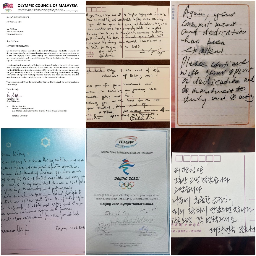 “再相见”,相知相伴相约来日再会。环境学院2020级博士生刘迪波与夏季奥林匹克项目国际单项体育联合会总会主席弗朗西斯科互赠礼物,约定米兰再见。刘迪波作为2名志愿者代表之一,受邀参加国际奥委会答谢招待会并接受巴赫主席颁赠五环徽章。希腊奥委会秘书长科林帕迪斯结束北京冬奥旅程之后,专门为新闻学院2018级本科生彭欣怡发来邮件,邀请她在疫情之后前往希腊相会:“无论如何,我都想再次见到你,来感谢你在我北京之行期间为我带来的帮助。我把你视作最好的朋友之一,所以也想用同样的方式回报你。”法学院2020级硕士生费子文、生命学院2020级博士生刘钟灵和马来西亚奥委会总经理冯晚豪如朋友般相处,约定“来一场从北方到热带的骄阳下的聚会”。韩国文化与体育观光部长官黄熙对智库中心教师李方晴发出再相会邀约:“如果你到首尔请联系我,一定再次见面”。