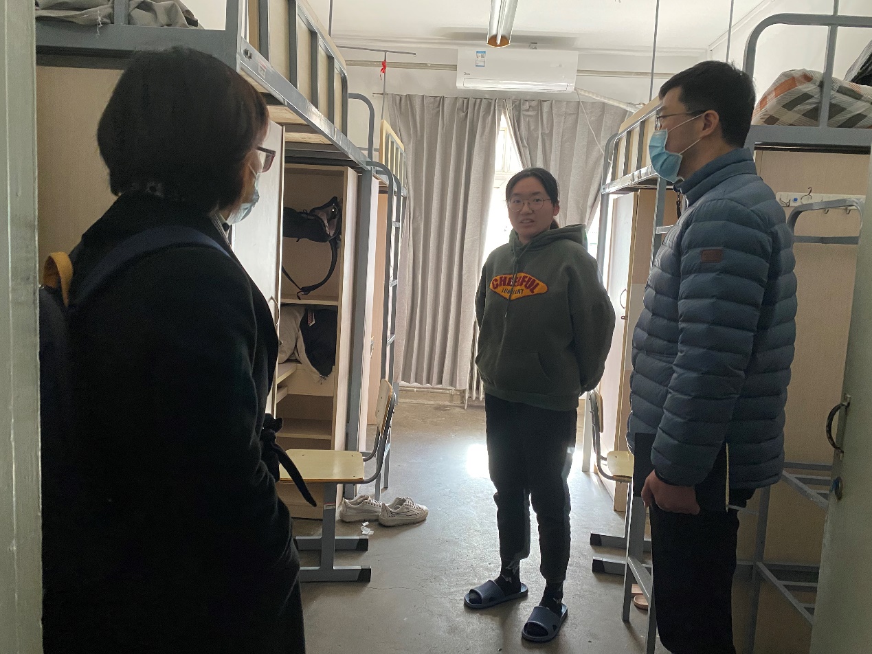 李一兵带队来到教学指挥中心、饮食中心冷库、集中健康观察点和学生宿舍、学生区快递站等点位,就疫情防控、消防安全等工作开展实地检查,推动责任落实、措施到位。李一兵听取了相关单位关于教学楼疫情防控和开学初期教学工作开展情况的介绍;检查了学校冷链环境和冷链食品储存,快递存放管理、消毒消杀和快递点秩序管理等情况;亲切慰问参与服务保障冬奥会的师生员工,详细询问了冬奥会志愿者管理情况,并对学生宿舍消防设施建设、运行及消防应急演练落实情况进行了认真检查。