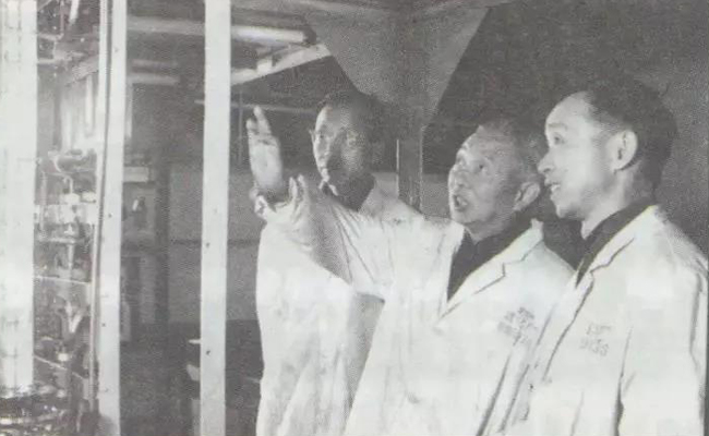 清华化工系教授汪家鼎指导研究生进行脉冲筛板萃取柱试验