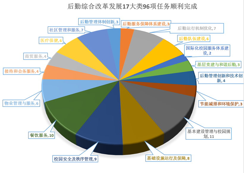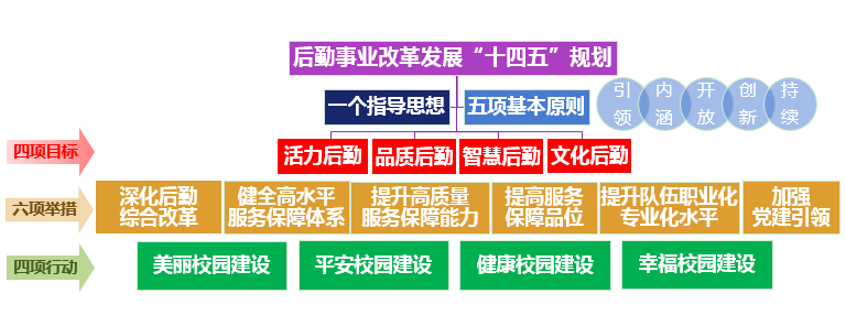 进入“十四五”新阶段,学校在完成“三个九年,分三步走”总体战略后,开启了迈向世界一流大学前列的新征程。后勤坚持以习近平新时代中国特色社会主义思想为指导,认真总结综合改革和“十三五”规划实施经验,主动对接学校“十四五”规划要求,谋划制定《乐动平台后勤改革与发展“十四五”规划》,梳理形成8大类86项具体任务,明确了任务时间表、责任人以及协同机制,并于2021年10月报学校核心会审议通过。规划明确提出,要把立德树人作为根本任务,把支撑学校一流大学建设作为首要责任,把满足师生员工对美好校园生活新期盼作为重要使命,把深化改革作为强大动力,把加强党的建设作为坚强保证,坚持引领发展、创新发展、内涵发展、开放发展、持续发展,努力打造活力后勤、品质后勤、智慧后勤、文化后勤,全面建设美丽校园、平安校园、健康校园、幸福校园。在后勤各单位密切配合下,后勤各项工作任务稳步推进,管理体制和运行机制持续优化,运行效率不断提高,后勤整体“作战”能力逐步增强。