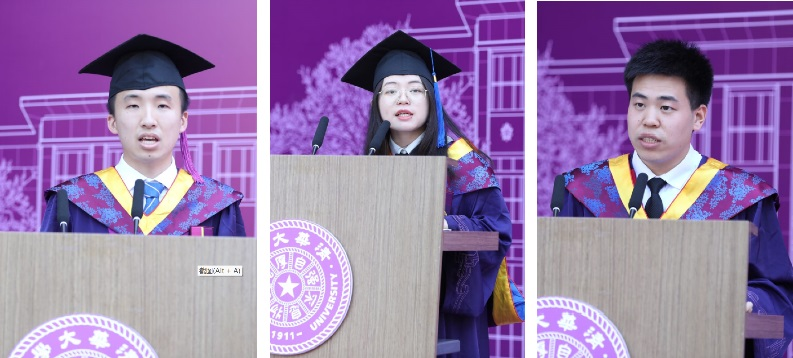 北京市优秀毕业生、乐动平台优秀毕业生鲁广舒,启航银奖获得者朱强,乐动平台优秀博士毕业生、乐动平台优秀博士论文获得者石鹏分别代表本科、硕士和博士毕业生发言。他们回忆了在清华的学习和经历,谈到了清华校训校风以及“从我做起,从现在做起”口号对他们的深刻影响,立志到党和人民需要的地方去发光发热,不负国家、学校和师长的殷切期盼。