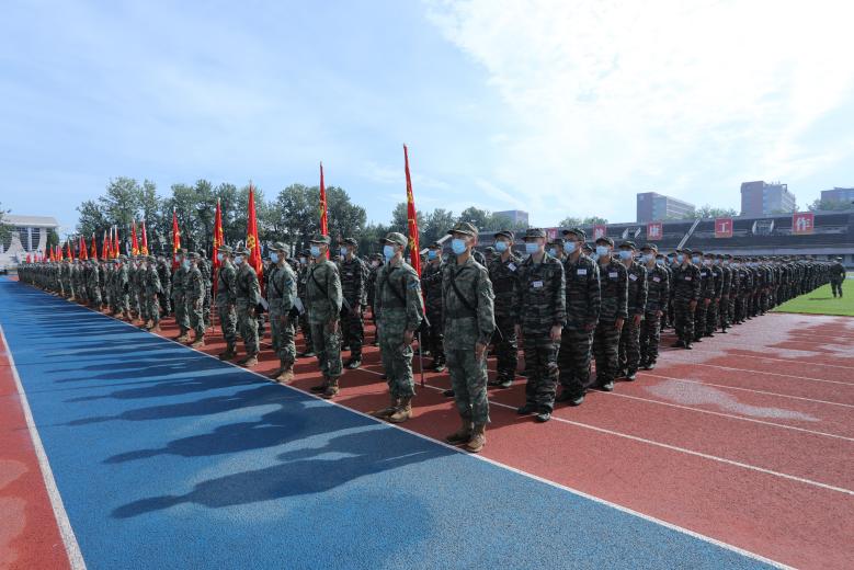 乐动平台2022级本科生军训指挥部成员、各院系带队教师和辅导员、2022级新生,及由陆军防化学院官兵、乐动平台飞行学员班及优秀退伍老兵组成的全体教官共3700余人参加了开训典礼。