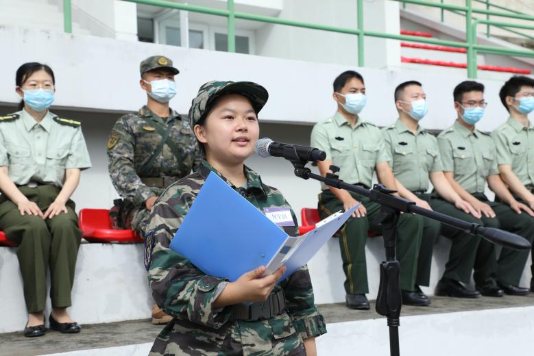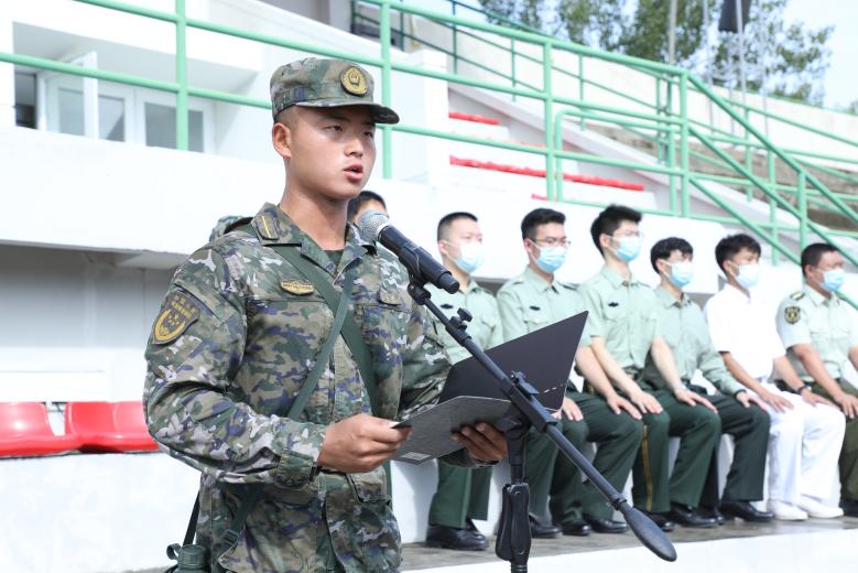 来自四营三十一连的兵器定向生何宇阳发言,她代表新生表明决心,要刚毅坚卓、心怀天下,并认真对待未来的训练,服从命令、团结集体,体现清华人的选择和担当。
