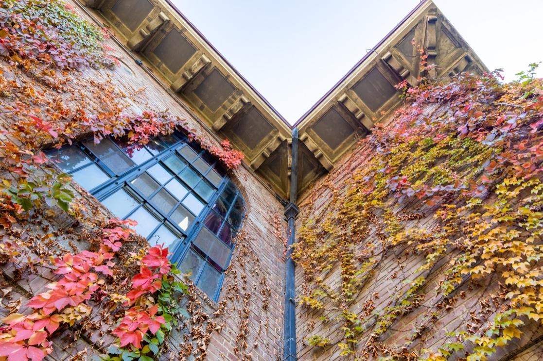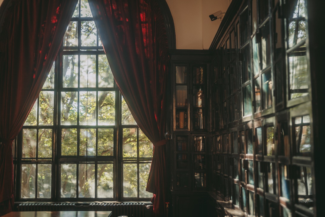 如今的老馆,木香扑面,石柱伫立,婆娑的树影落在书桌上,澄澈而清明。红墙上的爬山虎郁郁葱葱,日光透过拱形门窗,午后闲读的时间静谧悠长。翻页转场,听见纸张的呼吸,在阅读中前行。指尖划过文字,触摸思想的温度,在这里,任思绪跋山涉水,宽阔天地。