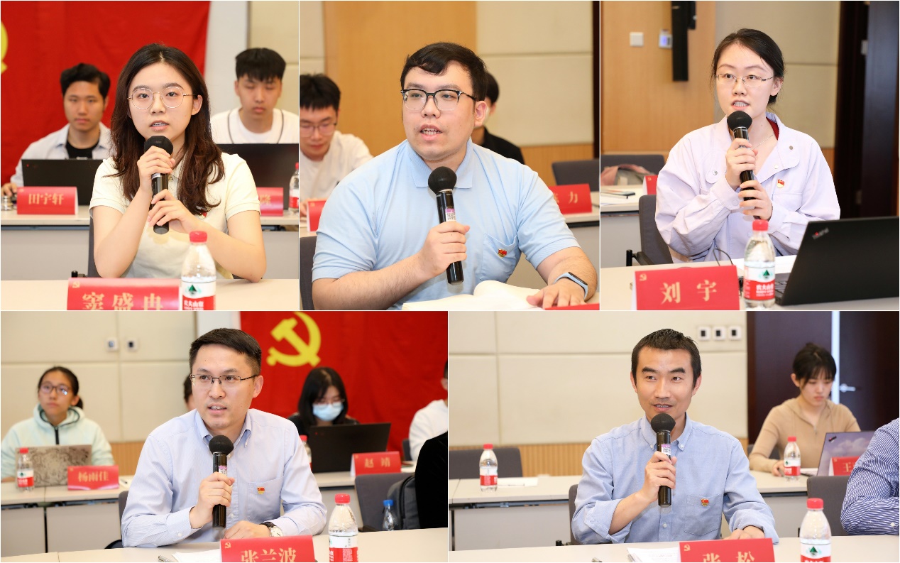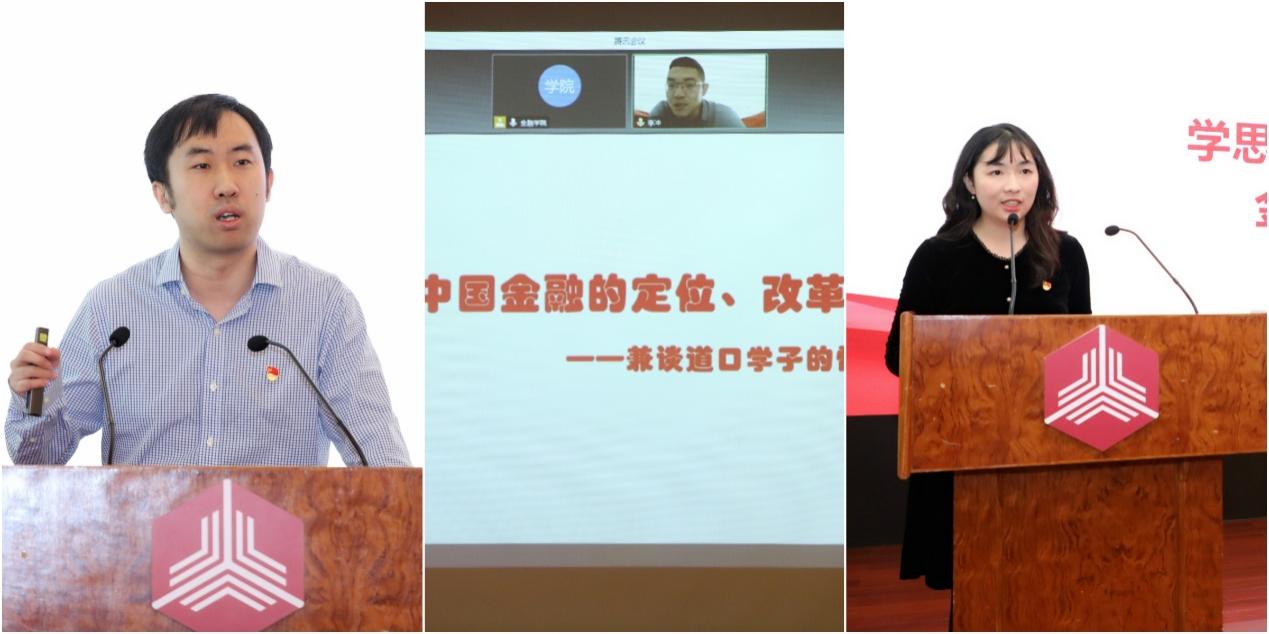 在交流环节中,全日制学生代表窦盛冉、刘畅、刘宇结合科研经历、社会工作与职业规划表示,当代青年要坚定理想信念,投身强国伟业;非全日制学生代表张兰波、张松结合在数字金融工作和数字金融风险管理方面的经历,分享了对“践行新发展理念,推动高质量发展”的理解。