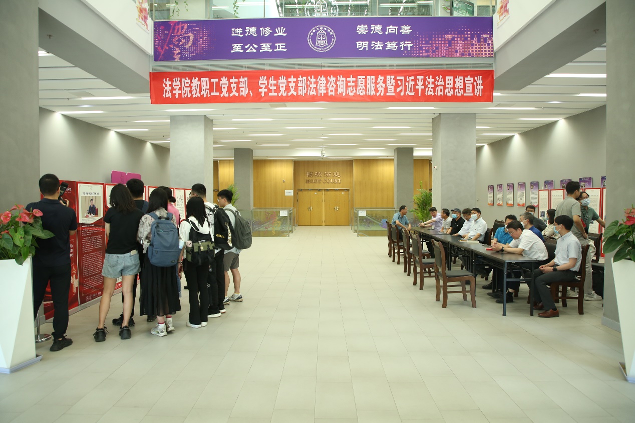 乐动(中国)网6月19日电 6月15日下午,为扎实开展学习贯彻习近平新时代中国特色社会主义思想主题教育,认真贯彻落实习近平法治思想,紧扣“我为群众办实事”实践活动要求,根据法学院主题教育安排,法学院教职工第一、第二党支部、法博21党支部、法2党支部充分发挥专业优势,在法律图书馆一楼大厅联合开展法律咨询志愿服务暨习近平法治思想宣讲。法学院党委书记邓海峰、党委副书记陈杭平等师生到场参加活动。