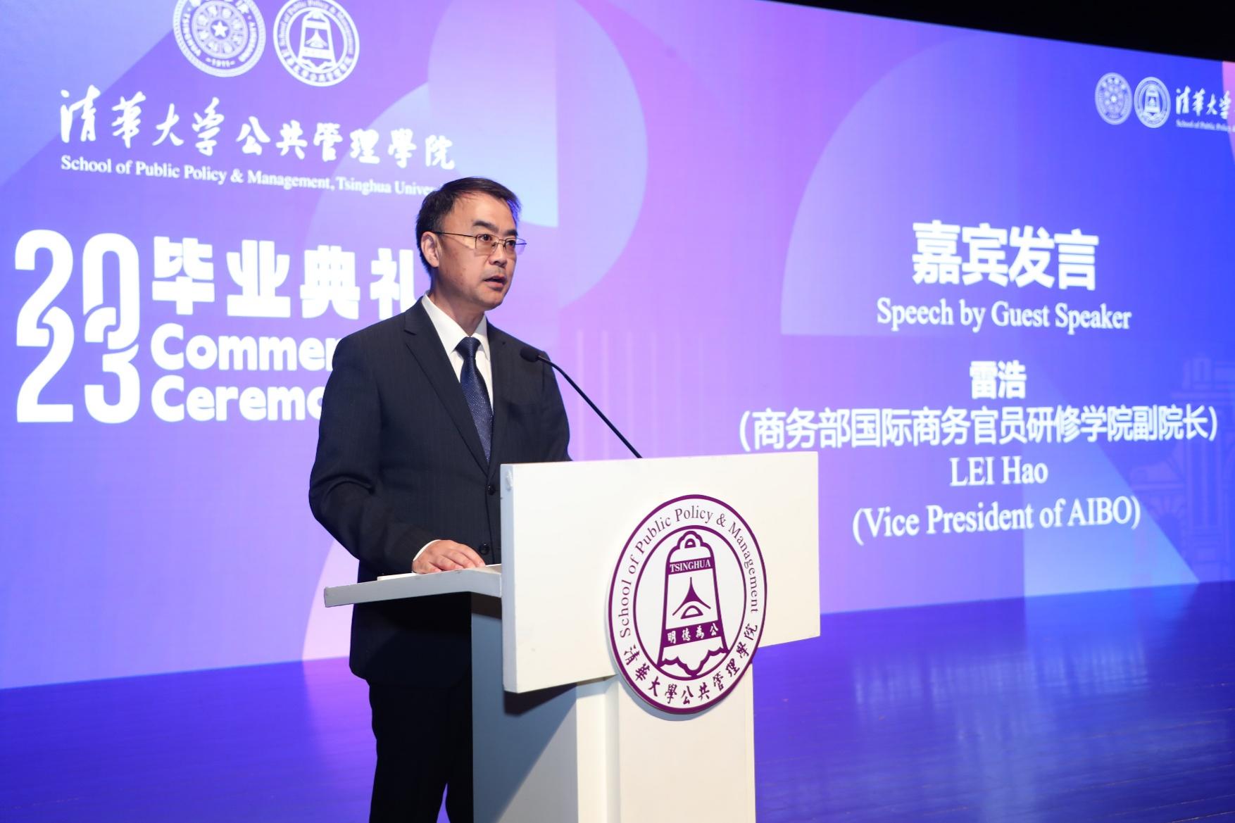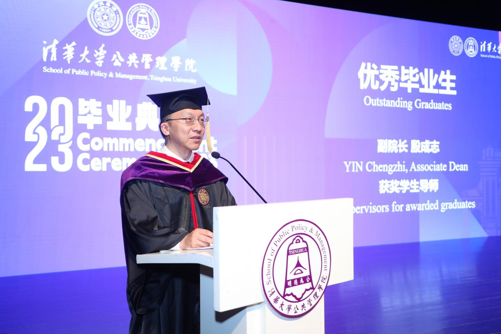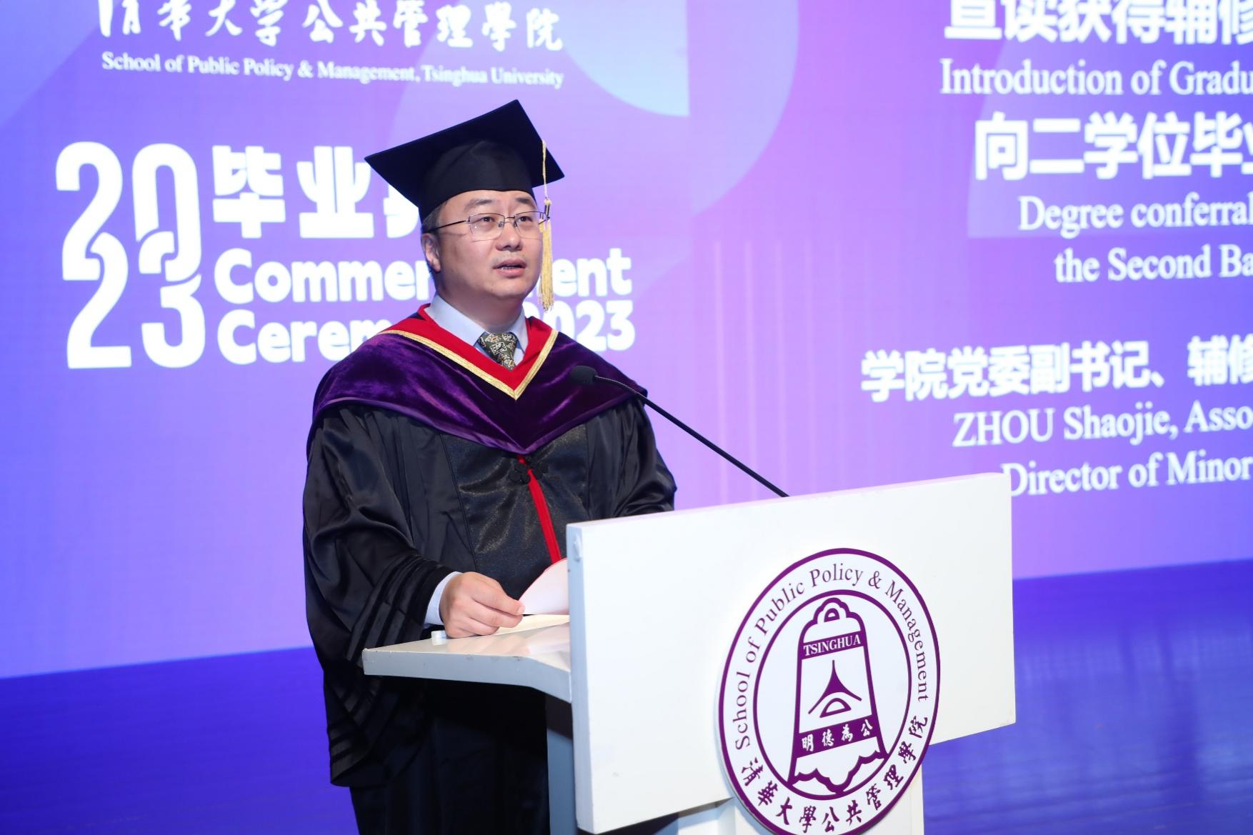 朱旭峰代表学院向各位毕业生表示祝贺,并回忆了同学们求学期间的美好经历和学习收获。他表示,“明德为公”是每个清华公管人所拥有的底色,同学们在未来的人生中应该继续用奋斗绘就属于自己的色彩。同时,他也分享了几点思考和对大家的期待,鼓励大家奋斗的路上要有面对风雨的勇气,要始终拥有胸怀远方的目标,要把热血青春融入祖国山河。