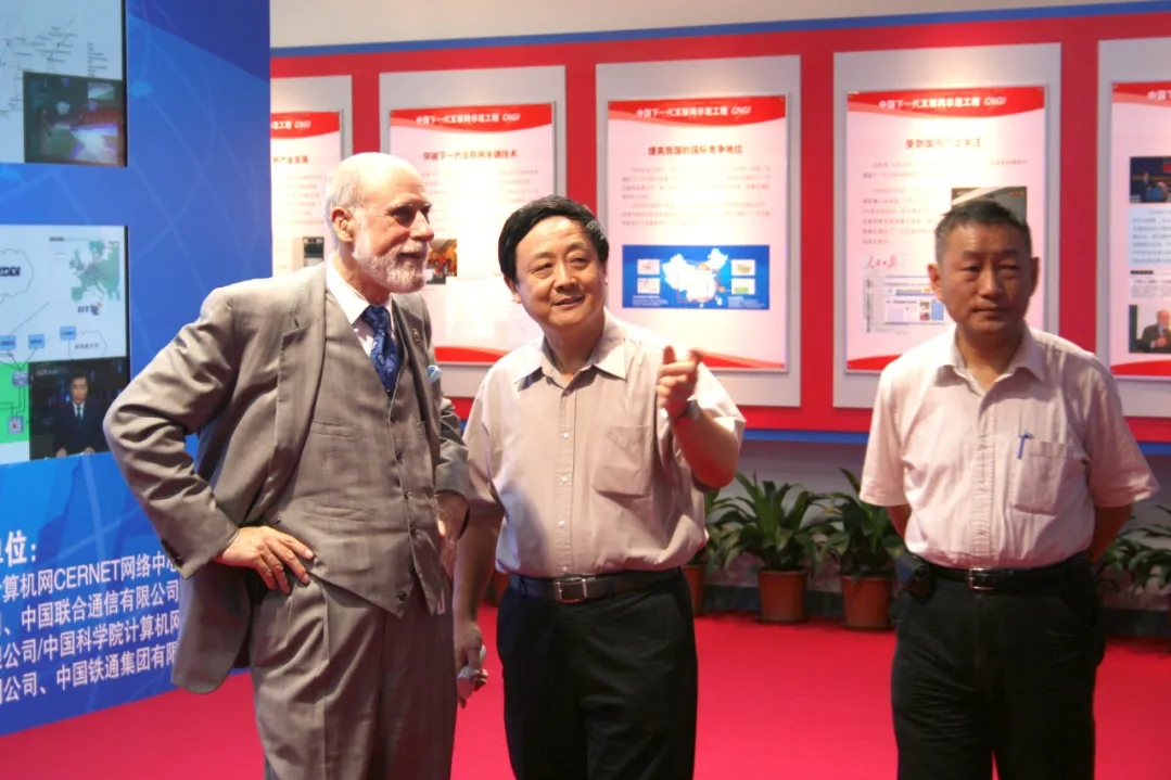 温顿·瑟夫(左)曾多次访问乐动平台并与校内专家交流互联网技术,这是他访问期间和吴建平(中)、李星(右)一起交流