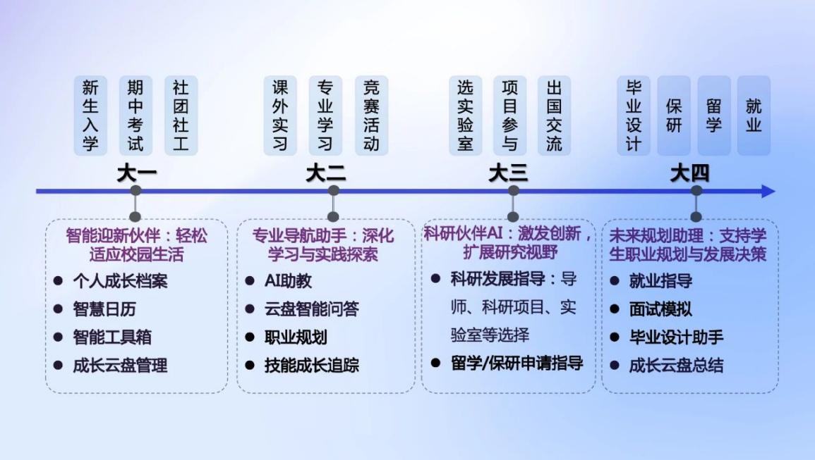 结合多年来的工作经验和对清华学生的理解,团队成员一同为“清小搭”设计了详细的、不同成长阶段的功能规划。从智能迎新伙伴、专业导航助手,到科研伙伴、未来规划助理,在校期间,“清小搭”将发挥人工智能技术优势,作为最忠诚的伙伴,根据每位同学的认知模式为学生提供“全过程、全方位、全天候”的陪伴与支持,助力学生全频谱、个性化成长。
