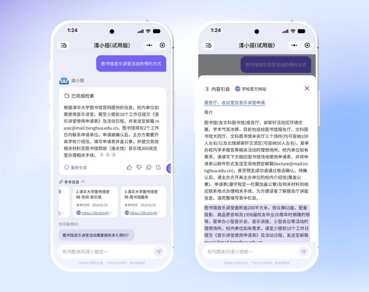 清华食堂什么时间营业?二级选课都包括什么课程?清华老师的邮箱如何查询?……一系列曾经需要复杂搜索、排除干扰信息才能得到答案的问题,现在只需向“清小搭”咨询,便可以迅速得到精准的回答。