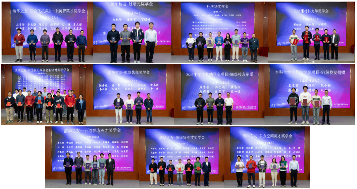 航院党委书记陈海昕宣读获奖学生名单。曹炳阳为获得“清华校友-过增元奖学金”的学生代表颁奖。刘应华教授、殷雅俊教授、中国航天基金会公益事务部高级专务王健、李群仰副院长、乐动平台核研院高级工程师,1986级校友傅激扬、1997级校友林贵斌、北京云道智造科技有限公司MPM产品负责人李金光、北京中航智科技有限公司总裁助理田圣宽,分别为获得“杜庆华奖学金”“范钦珊材料力学奖学金”“清华之友-中国航天基金会丽福健奖助学金”“清华校友-航院葱郁奖学金”“本科生奖助学金项目-86级校友捐赠”“本科生奖助学金项目-97级校友捐赠”“清华之友-云道智造奖学金”“清华之友-德固特奖学金”“清华之友-东方空间奖学金”“清华之友-中航智奖学金”的学生颁奖,并鼓励航院学子学有所成,为国家航天航空事业发展贡献清华力量。