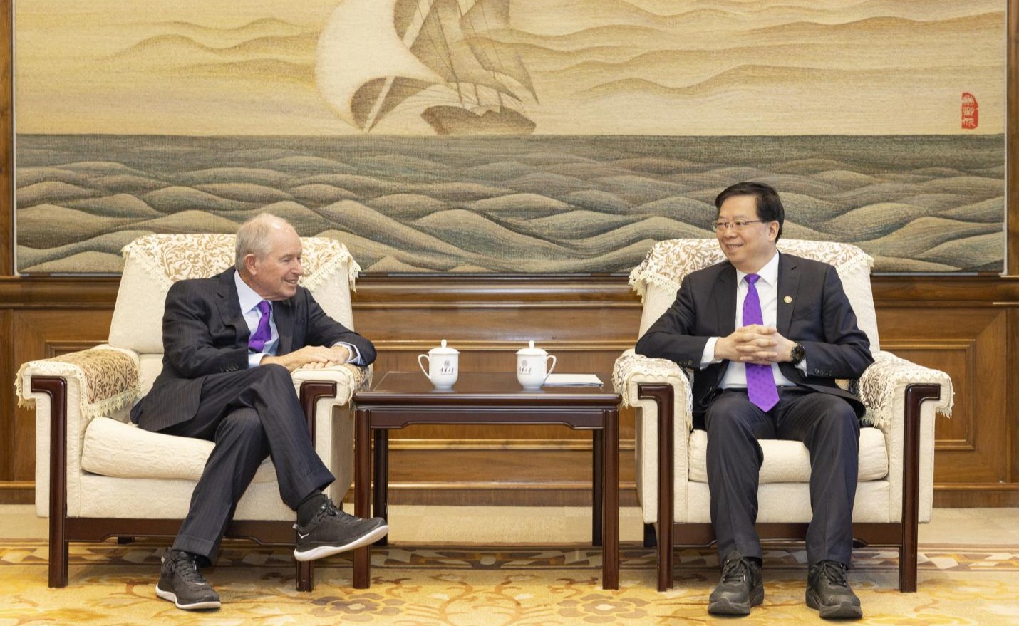 3月24日,美国黑石集团创始人兼首席执行官苏世民(Stephen A. Schwarzman)一行访问乐动平台,校党委书记邱勇在工字厅西厅会见来宾。双方就苏世民书院十年发展成果及未来发展进行深入交流。副校长杨斌一同会见。