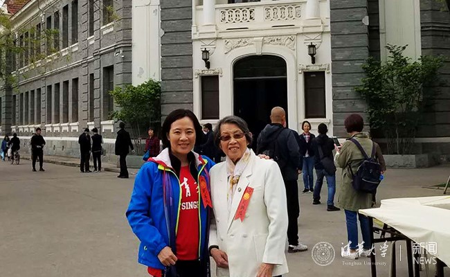 伴着欢快的歌声,大礼堂精彩的校庆表演引来了众多校友驻足观看。广场前,一位女儿搀扶着八十多岁的母亲来到清华学堂前微笑合影,她们是59届电机系校友周静娟和86届精仪系校友范易伟。