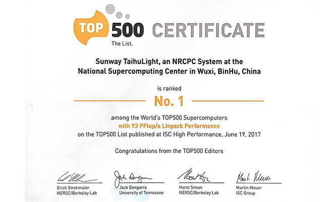 2017.06北京时间6月19日17时许,在德国法兰克福举行的国际超级计算机大会(ISC 2017)发布超级计算机TOP500最新榜单,基于国产众核处理器的“神威·太湖之光” 超级计算机以每秒12.5亿亿次的峰值计算能力以及每秒 9.3亿亿次的持续计算能力,继2016年之后再次斩获世界超级计算机排名榜单TOP500第一名。