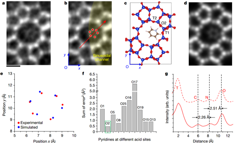 近日,魏飞团队借助于包含酸性位点的孔道允许吡啶分子较大机率形成平躺稳定构象的原理,制备了利于观察的高硅铝比准二维片层ZSM-5(2-3个单胞厚度),利用电子显微镜技术,首次实现了在室温下ZSM-5分子筛孔道内限域的有机小分子(吡啶、噻吩)的原子级成像...