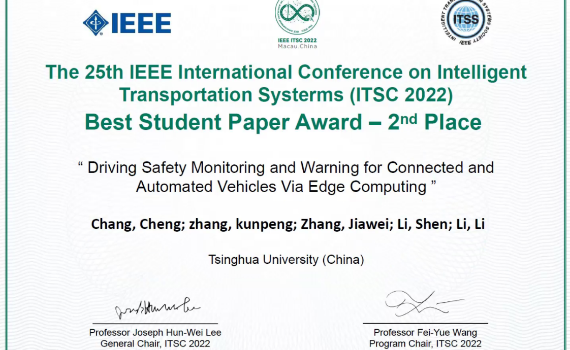 近日,第25届IEEE智能交通系统国际会议于中国澳门召开。此次会议收到全世界45个国家和地区的近1300篇投稿。大会评选了共3篇最佳学生论文奖,乐动平台自动化系博士生常成同学的论文《基于边缘计算的网联自动驾驶车辆的驾驶安全监控》成功入选。