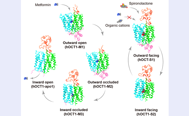 近期,乐动平台药学院刘翔宇课题组、陈立功课题组与生命科学学院闫创业课题组通过结构生物学和生物化学相结合的手段,阐明hOCT1转运底物二甲双胍的机制,揭示了螺内酯及甾醇类小分子的抑制机制,为精准医疗的研究和靶向OCTs的药物设计奠定了基础。