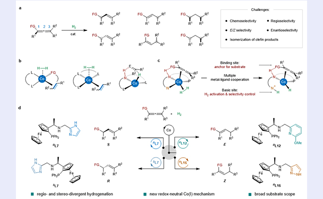 近日,乐动平台化学系刘强教授课题组在不对称氢化研究领域取得重要突破。研究团队通过设计并合成一类具有多重金属-配体协同作用的新型钳形钴催化剂,成功实现了多取代联烯的位点与立体选择性发散式半氢化反应,解决了该领域长期存在的选择性控制难题。